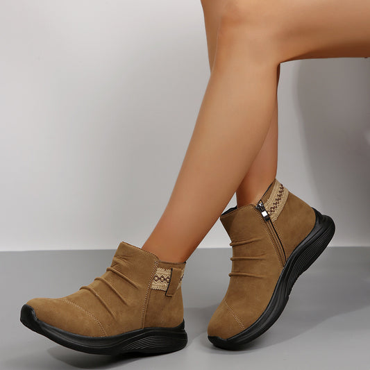 Bottes courtes plissées pour femme – Semelle épaisse, fermeture zippée latérale, bout rond en daim – Style Martin tendance et confortable
